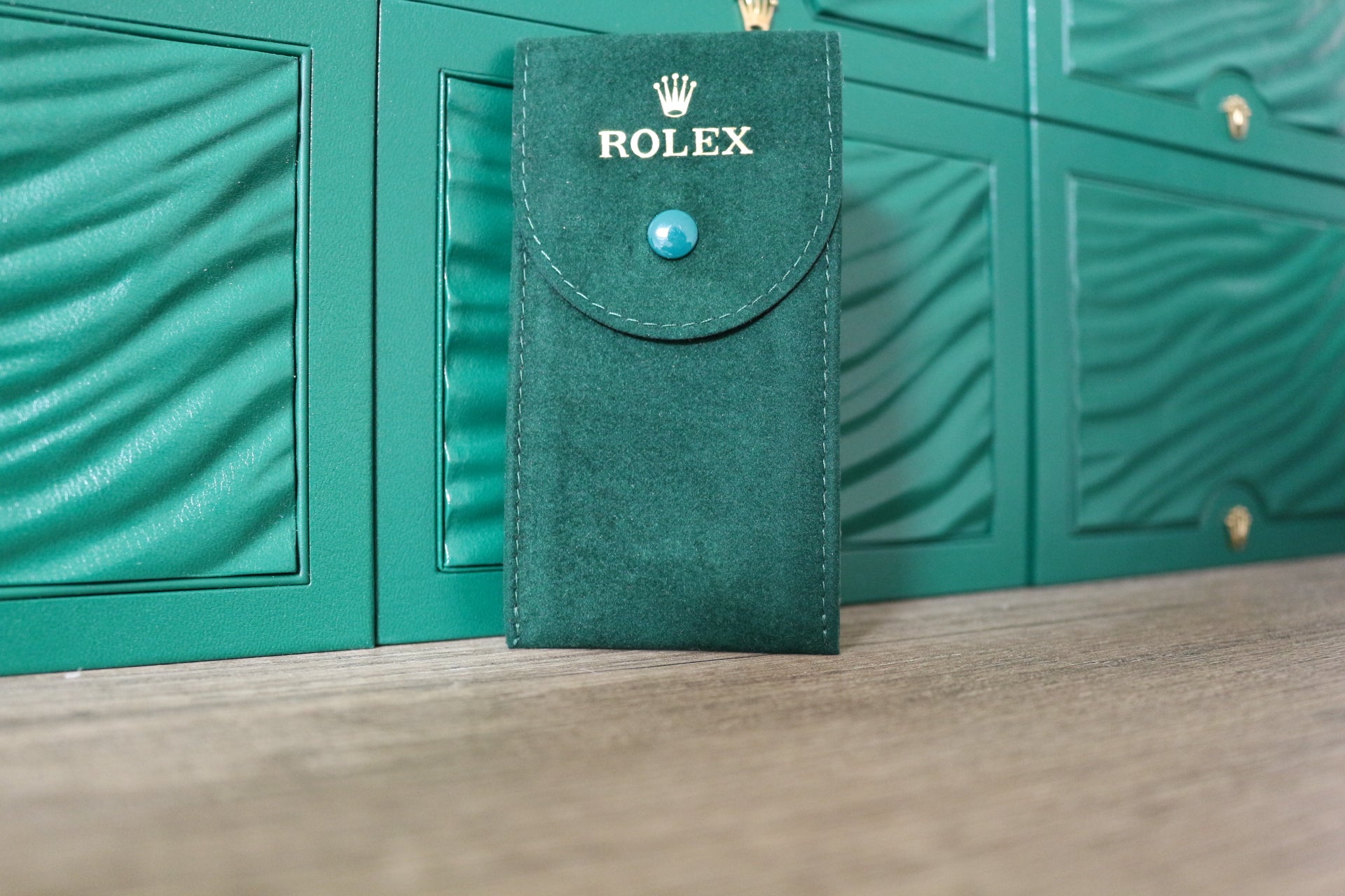 Das Rolex Travel Case Pouch Service Etui ist das perfekte Accessoire für alle Rolex-Liebhaber, die auf Reisen ihre Uhren stilvoll und sicher transportieren möchten. Hergestellt in der Schweiz aus hochwertigem Velvet-Material, bietet das grüne Etui Platz für eine Uhr und schützt sie vor Kratzern und Stößen. Das Etui ist 100% original und eignet sich auch perfekt als Geschenk für Uhrenliebhaber.